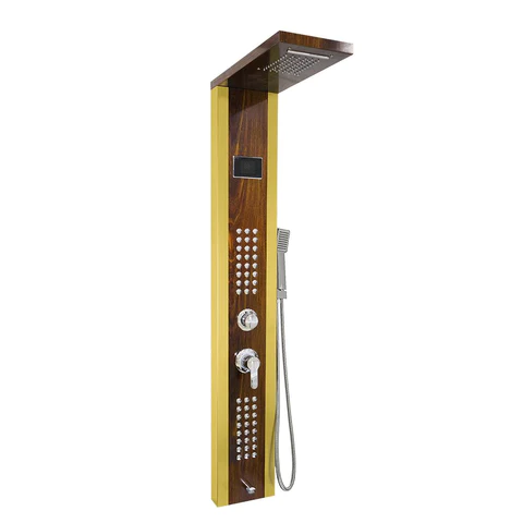 ( طلب مسبق ) شاور بانل W008GT كاملة بشاشة ديجيتال بطول 145سم 60 جيت علوى و 48 جيت جانبى بإضائة علوية وسماعة جانبية وخرطوم اللون ذهبى لامع × خشبى من MS